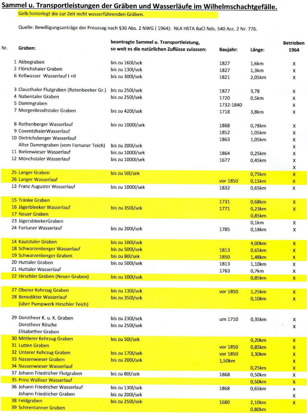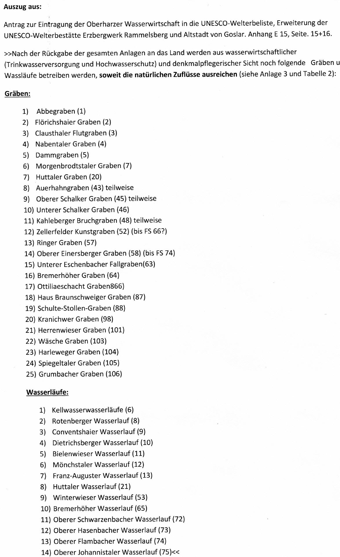Nach der Rückgabe der gesamten Anlagen an das Land (Niedersachsen, Anm. des Verfassers) werden aus wasserwirtschaftlicher (Trinkwasserversorgung und Hochwasserschutz) und denkmalpflegerischer Sicht noch folgende Gräben betrieben werden, soweit die natürlichen Zuflüsse ausreichen (siehe Anlage 3 und Tabelle 2):<<