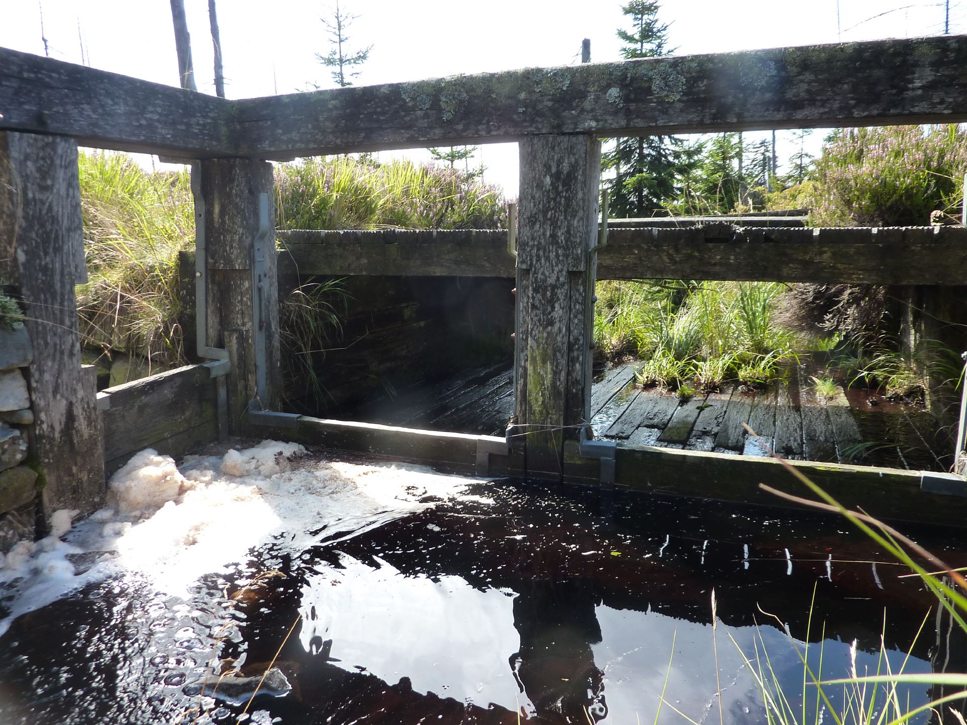 Es wurde durch fest verschraubte Bretter ersetzt, der Wasserstand im Graben ist nunmehr fest eingestellt.
