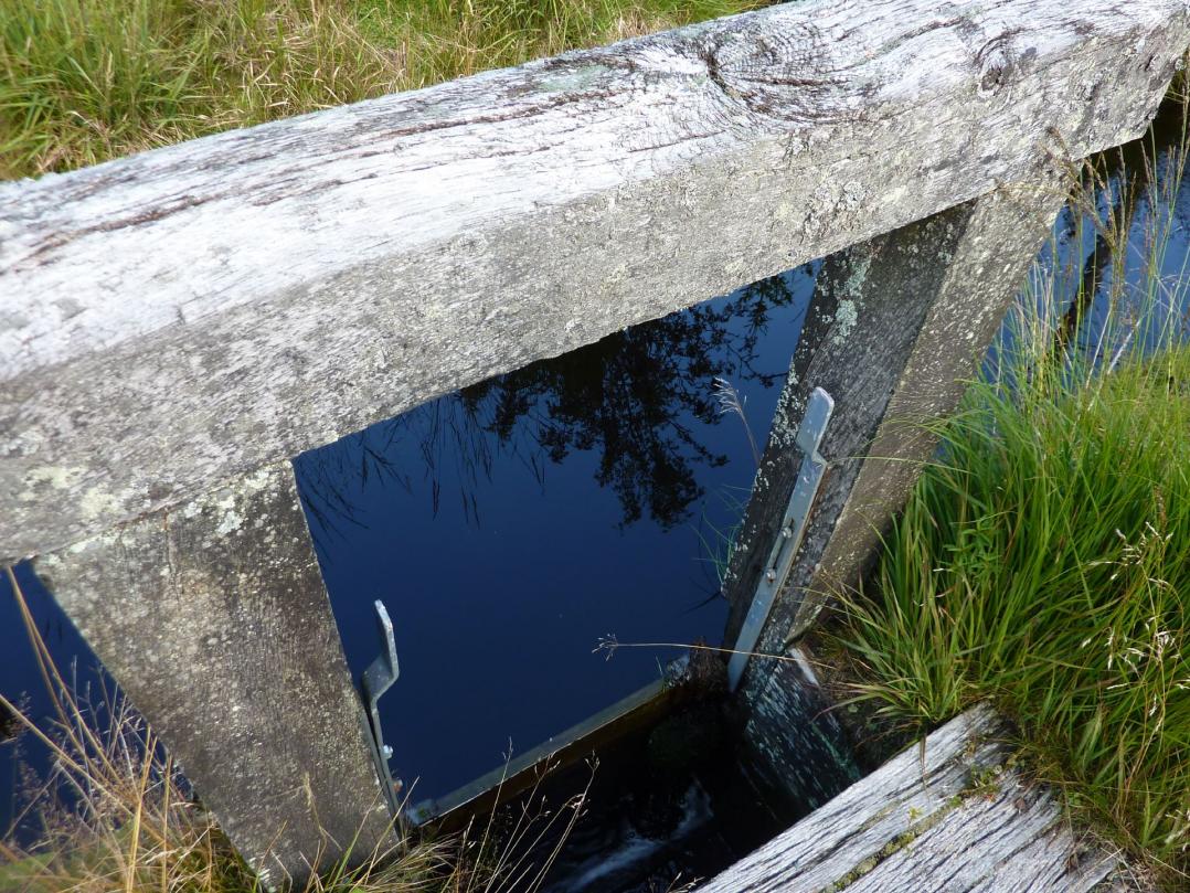 Auch an diesem Graben sind die verstellbaren Spindelschütze verschwunden. Die Wasserführung wird durch fest eingestellte Schützenbretter geregelt.
