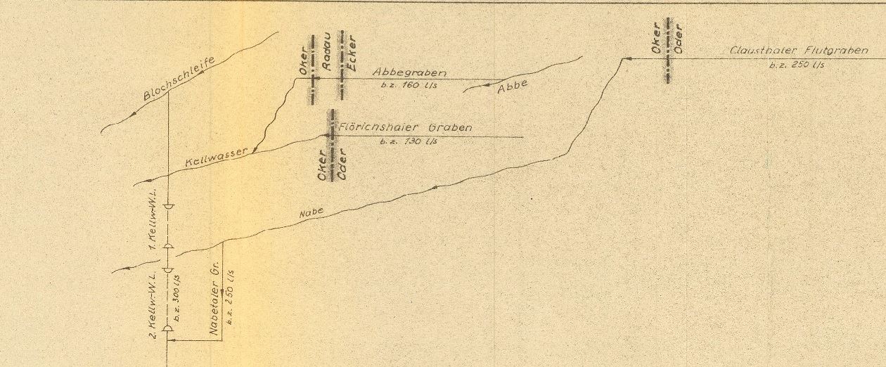 Der betriebene Clausthaler Flutgraben wird von der Preussag 1964 mit 250l/sek angegeben und hätte in Spitzenzeiten ein einen ähnlichen Abfluss wie den von Peiffer für den Dorotheer Kunst u. Kehrradsgraben angibt.