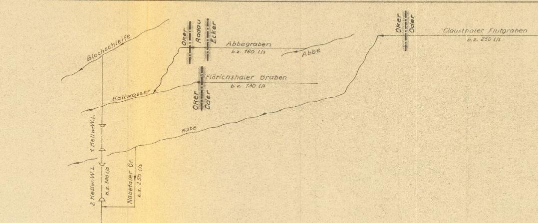 Die Wasserführung der betriebenen der Gräben der Preussag im Vergleich zur Wasserführung der heutigen betriebenen Gräben.
