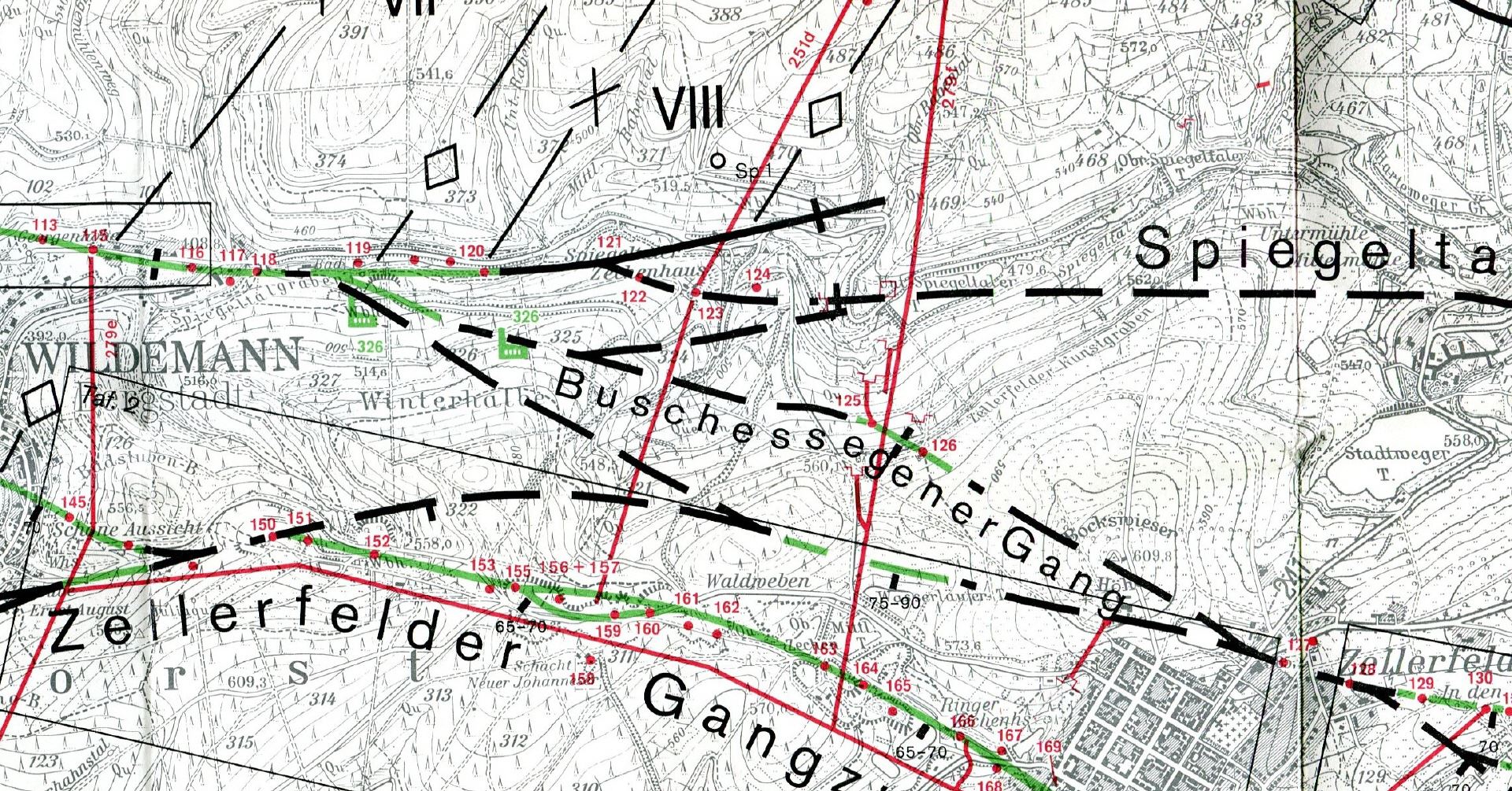 Karte: Ausschnitt aus der Gangkarte des Oberharzes mit dem Spiegeltaler und dem Zellerfelder Gangzug bzw. Buschesseegener Gang. Grün eingezeichnet die Erz führenden, schwarz die tauben Gänge.
