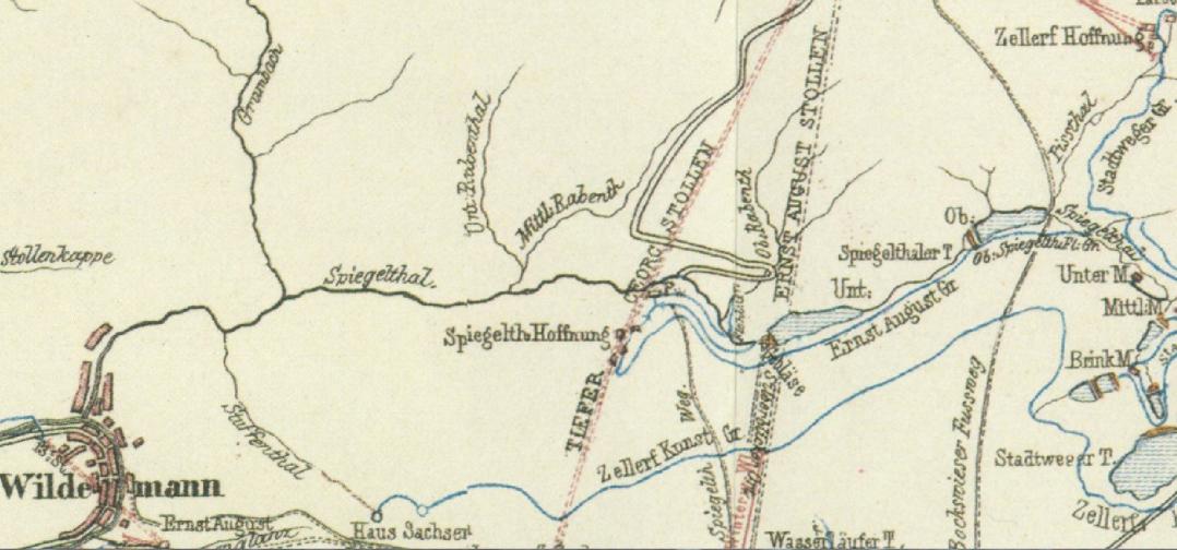 Hier irrt Haase wohl, denn laut der Karte von Krieghoff haben beide Gräben keine Verbindung, der Ernst-August-Graben liegt sogar etliche Höhenmeter tiefer. Das Wasser fließt erst durch die Freiflut am Spiegeltaler Hoffnung-Schacht, bevor es im Ernst-August-Graben gefasst wurde.