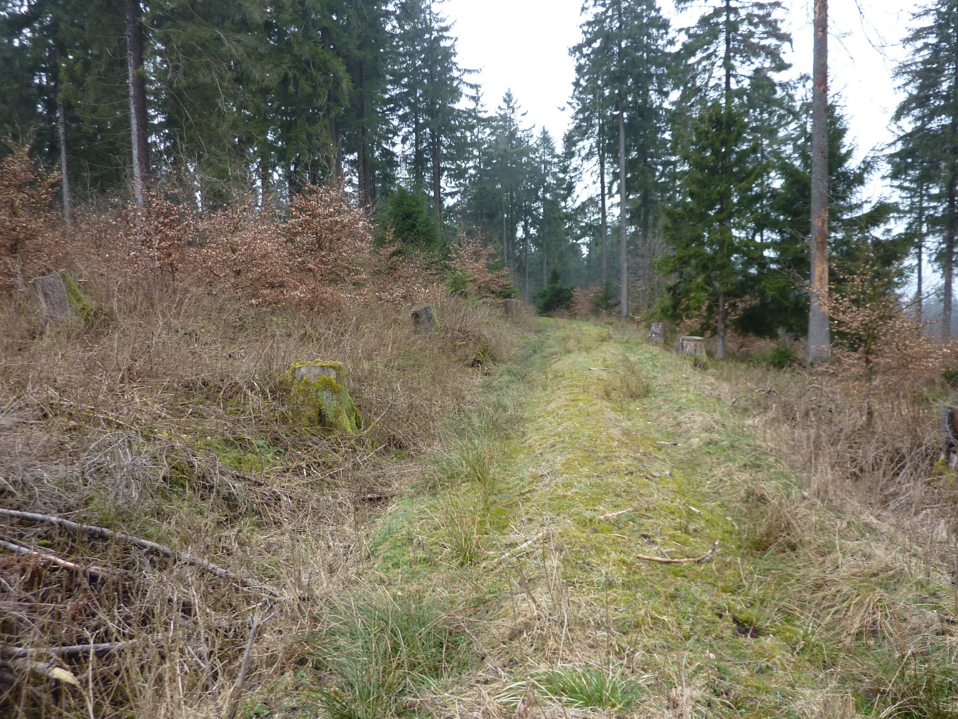 Bild: Der Haus Sachsener Kehrradsgraben, heute über weite Strecken nur noch eine Rille im Gelände. Nur kurz vor dem ehemaligen Johanneser Kurhaus ist der Graben über eine kurze Strecke halbwegs intakt.