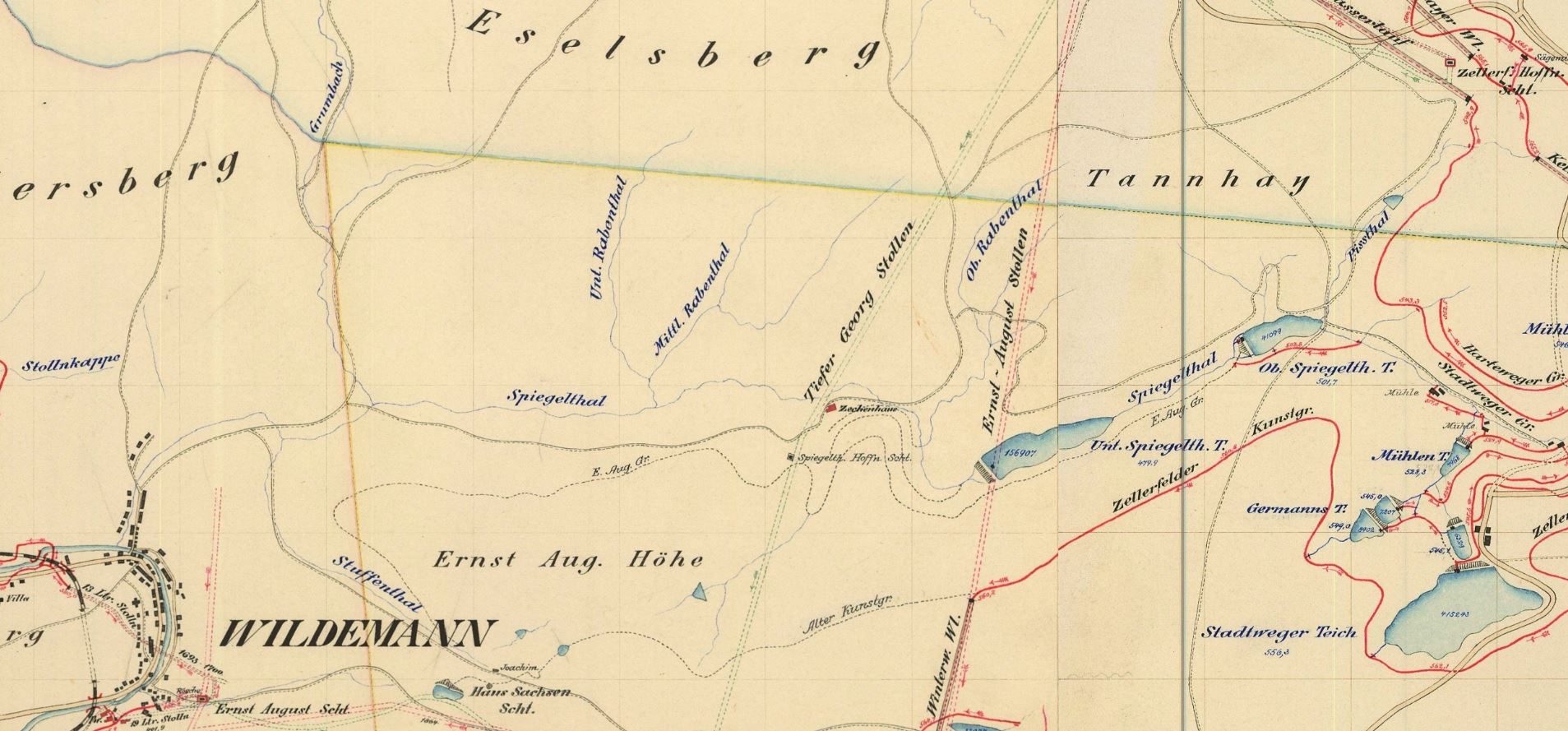 Die Aufschlaggräben für den Spiegeltaler Hoffnung-Schacht finden sich auf der Karte von Dumreicher aus den Jahr 1866.