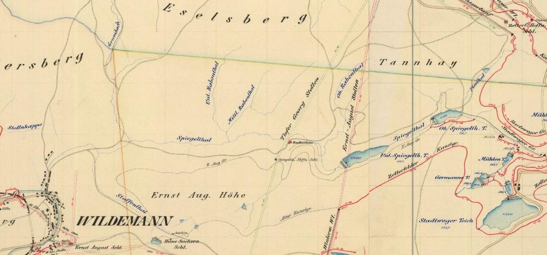1893, auf der Karte von Sandkuhl, ist nur noch der Obere Spiegeltaler Flutgraben, der Wasser um den Oberen Spiegeltaler Teich führt, wasserführend.