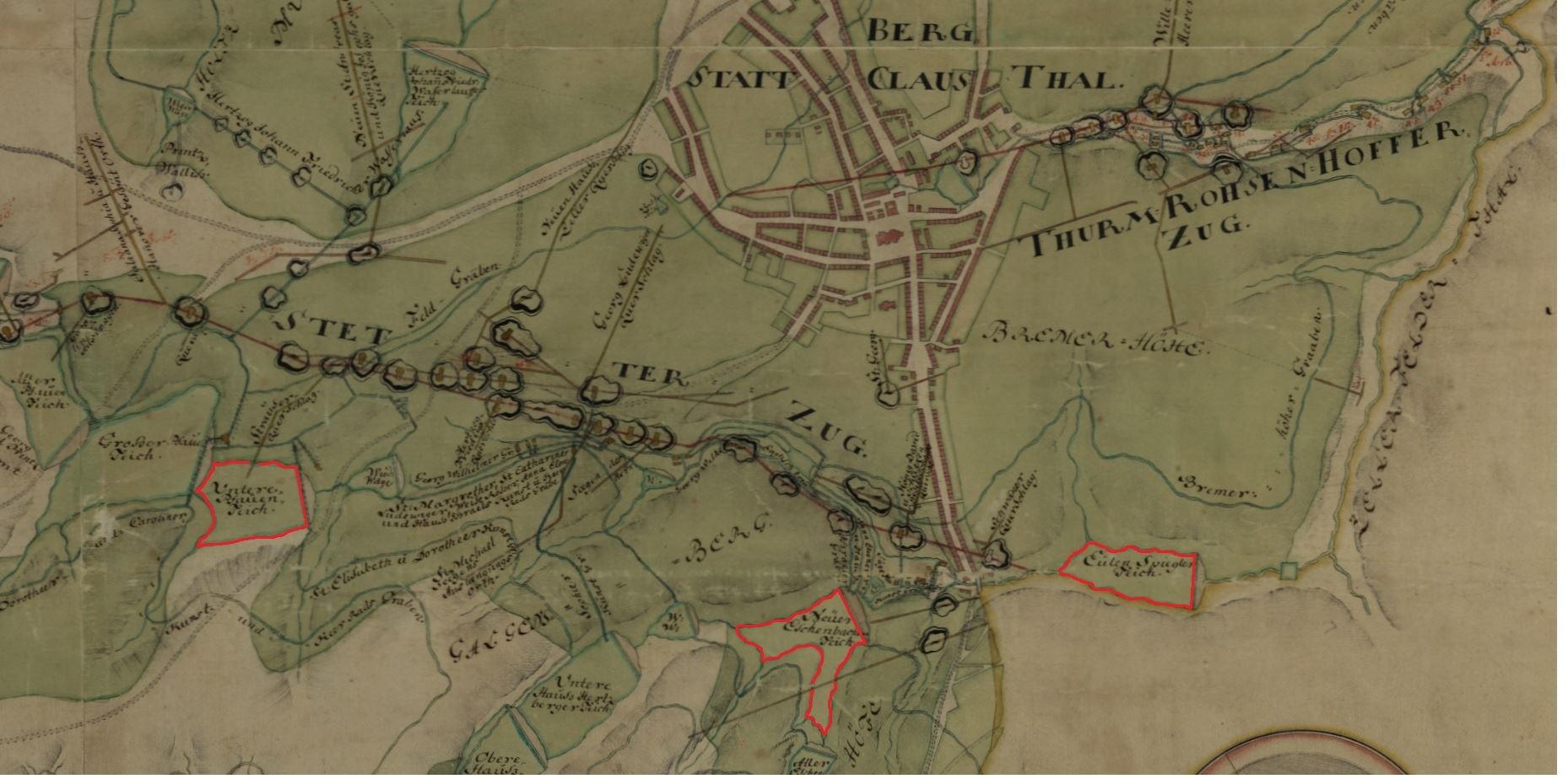 1743 stellt der Oberbergamtsmarkscheider Rausch unterhalb des Unteren Pfauenteichs (unten Links) eine Wiederwaage dar. Der Untere Eschenbacher Teich sowie der Eulenspiegler Teich sind ebenfalls hier eingezeichnet. Der Hüttenteich (vor 1680) sowie der Carler Teich (vor 1563) haben hier keine Erwähnung gefunden. Der Zellbach ist Grenzgewässer zwischen den Fürstentümer Braunschweig-Grubenhagen und Braunschweig-Wolfenbüttel. Rausch stellt nur den grubenhagischen Teil auf seiner Karte dar.