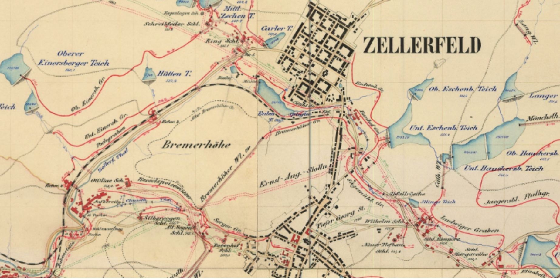 "Im Zellbachtal bilden die folgenden Staubecken mit ihren Wassern das "Zellbachgefälle": der Untere Fall des Unteren Eschenbacher Teiches entläßt sein Wasser in den Zellbach; der Bach läuft um den Eulenspiegler Teich herum. Es folgen die die Zugänge vom Eulenspiegler Teich und vom Carler Teich . Aus dem Zellbach wurde das Wasser auf die andere Seite des Tales in den 4. Pochgraben gelenkt, wo sie durch die Zuflüsse vom Hüttenteich verstärkt wurden. Schließlich trafen die Wasser des Mittleren Einersberger Teiches und des Unteren Falls des Oberen Einersberger Teiches hinzu. Diese Mengen wurden in der Einersberger Zentrale mittels Pumpen zum Ottiliae-Schacht gehoben."