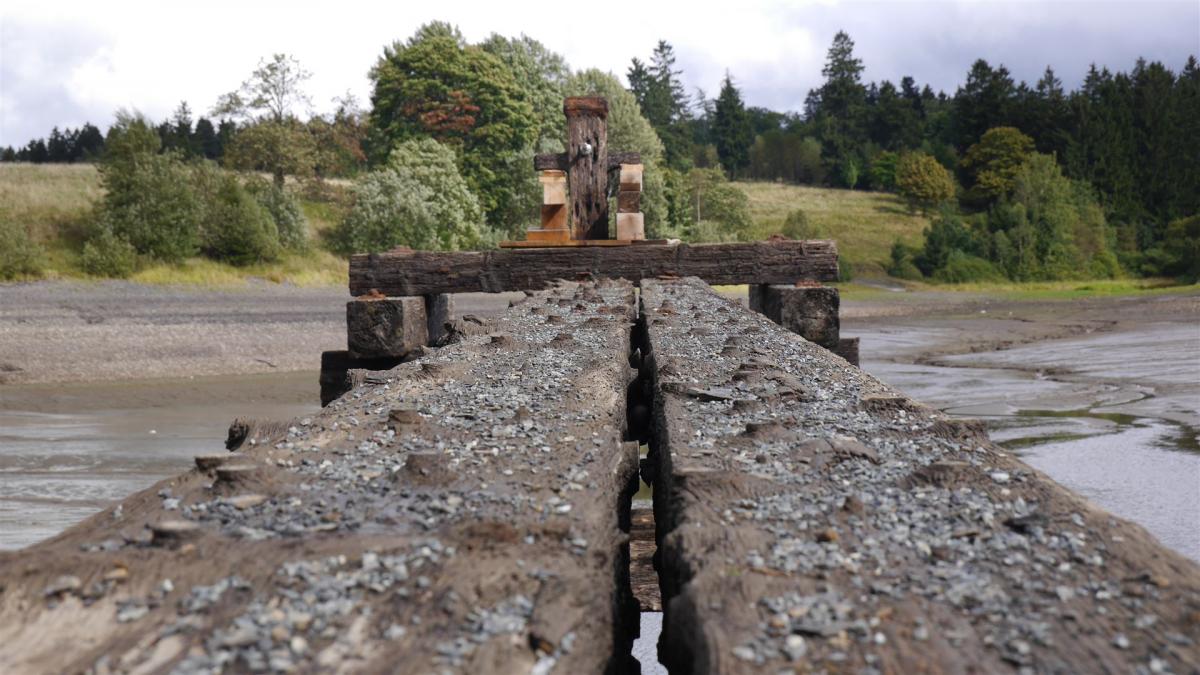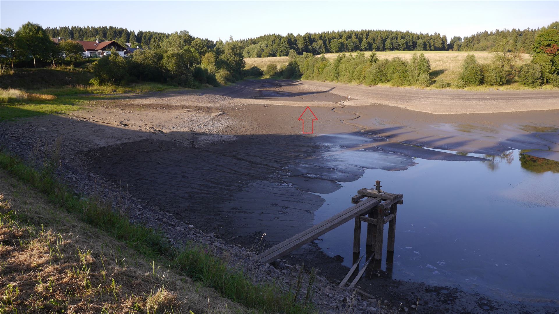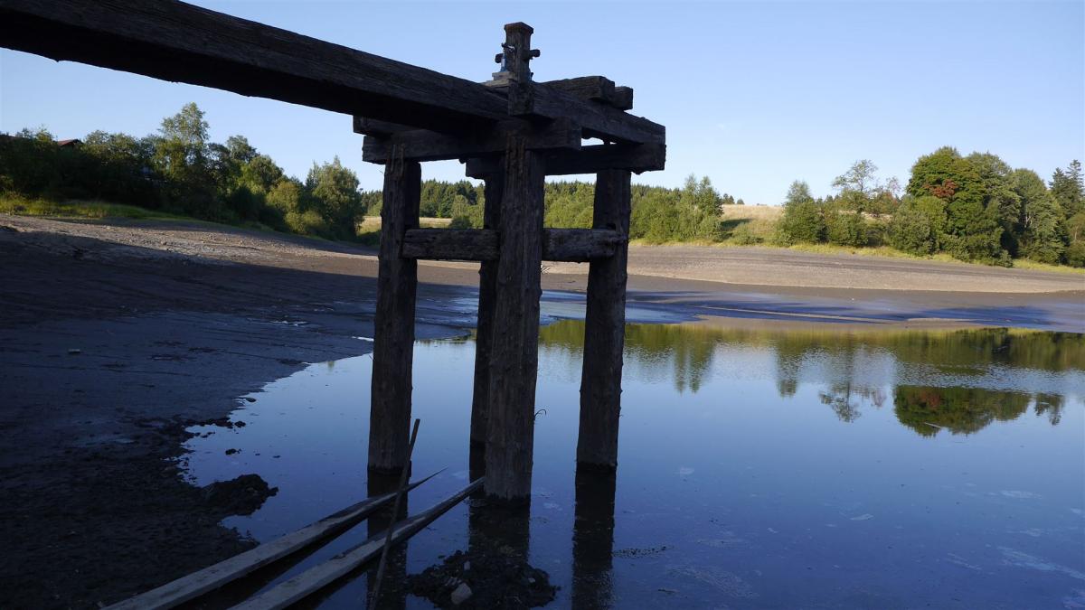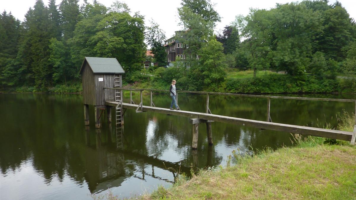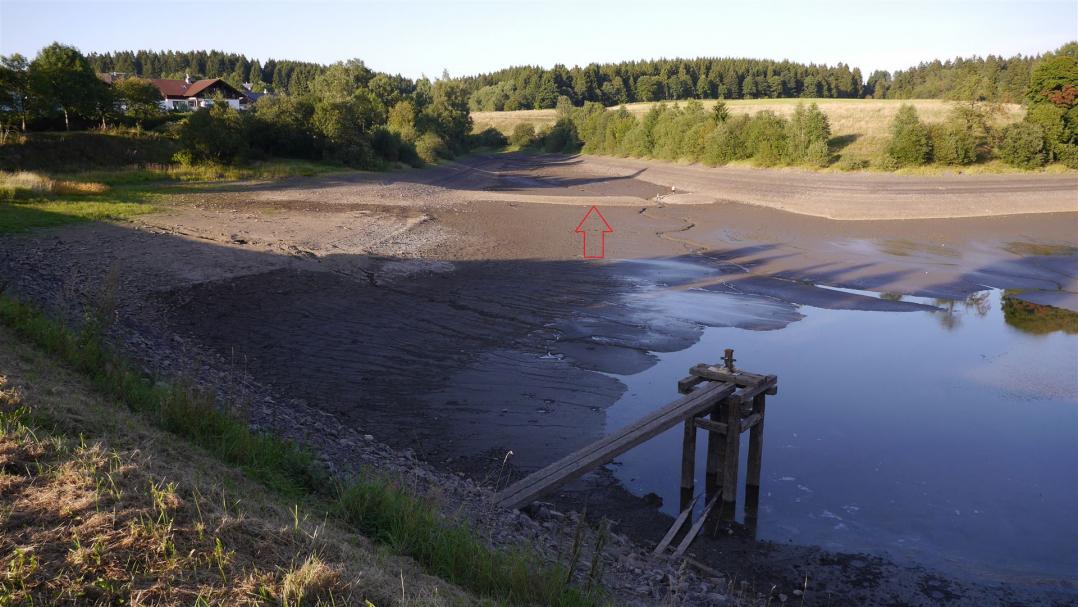 Auf dem Grund des Teiches wird bei niedrigem Wasserstand der Damm des ältesten Stauteiches im Oberharz, dem "Bavendik" sichtbar.