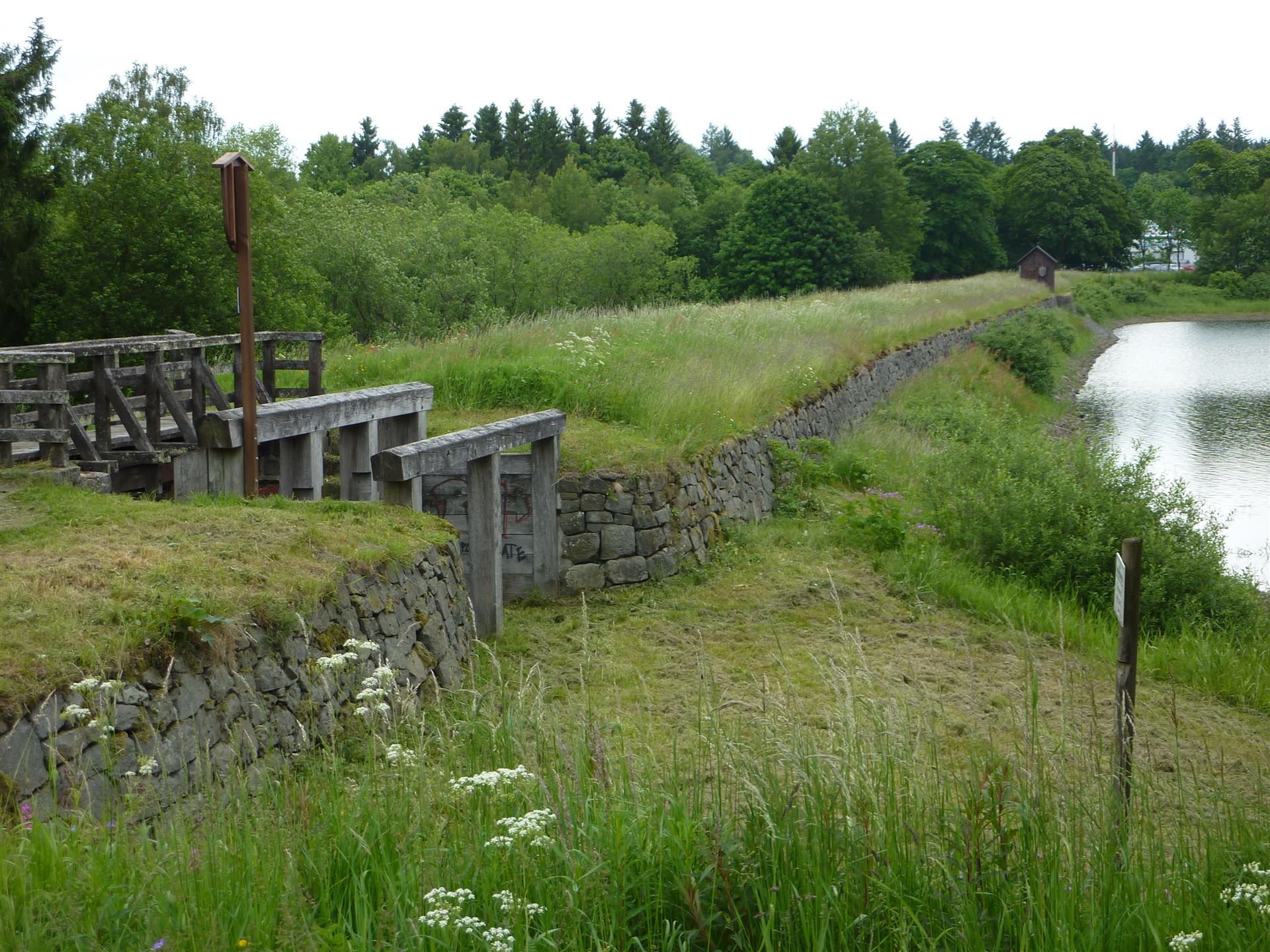 Der Damm des Unteren Pfauenteiches. Im Vordergrund die Ausflut (Überlauf des Teiches). In der Mitte des Dammes das Striegelhäuschen für den "Unteren Fall".