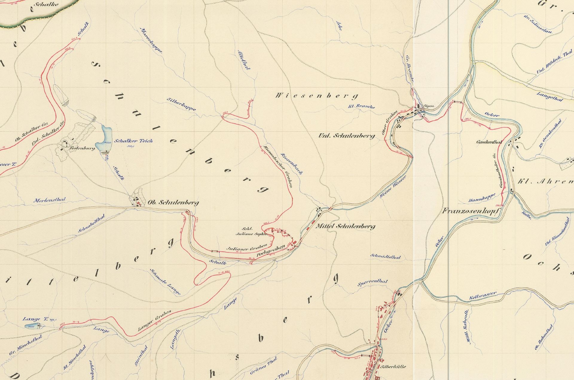 1675 schon wurde das Wasser aus der Schalke durch den "Wassergrabe aus der Schalke", dem späteren Oberen Schalker Graben, hinübergeleitet in das Bockswieser Revier und nach Hahnenklee.