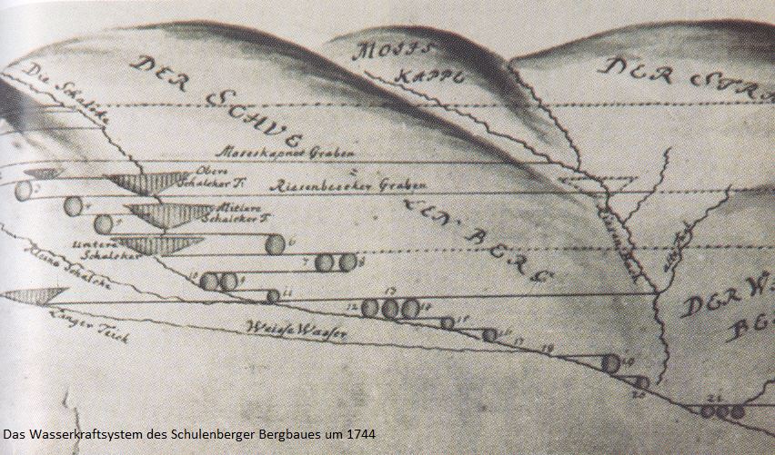 >>Der Schulenberger/Festenburger Bergbau spielte im Gesamtgeschehen des Oberharzer Bergbaus nur eine Nebenrolle. Ihm wurde Betriebswasser durch die Schalker Gräben entzogen, was sich auf Grund des des relativ kleinen betroffenen Einzugsgebietes nicht nachteilig bemerkbar machte. Wie auch der Altenauer Bergbau kam er weder in den "Genuß" der tiefsten Wasserlösungsstollen, noch wurde er in das System der Oberharzer Wasserwirtschaft eingebunden.<< (Knissel/Fleisch, 1983; 63)