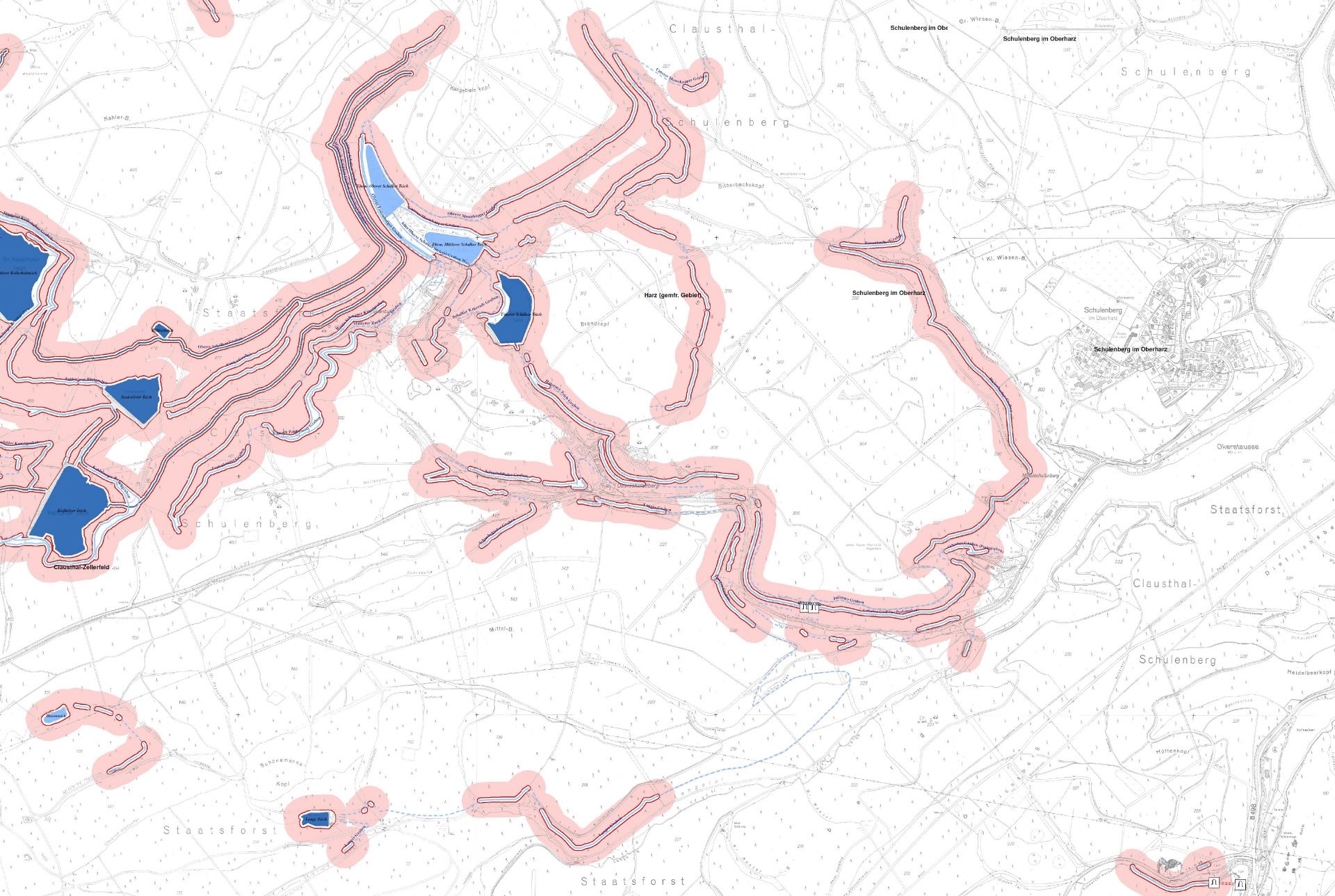 Der Lageplan von Martin Schmidt zeigt die über die Jahrhunderte entstandenen Gräben im Festenburg/Schulenberger Revier. Die in der Okertalsperre untergegangenen Gräben sind hier nicht mit erfasst.