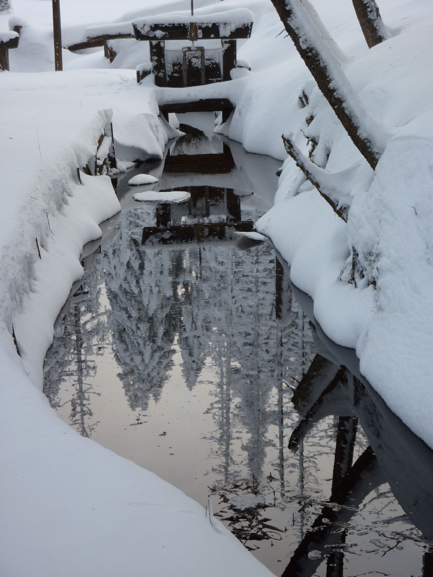 Der Fehlschlag in Bildmitte stammt aus dem Jahr 1988. Er ist mit herausnehmbaren Schützenbrettern ausgestattet, falls eine Reparatur an einem nachkommenden Grabenabschnitt ansteht, kann hier das auf der Grabenstrecken aufgefangene Wasser "fehlgeschlagen", abgeleitet, werden. Der hintere Fehlschlag ist, obwohl jünger, von 1994, noch mit einem Spindelschütz versehen. Hier kann die Durchflussmenge für den folgenden Grabenabschnitt eingestellt werden.