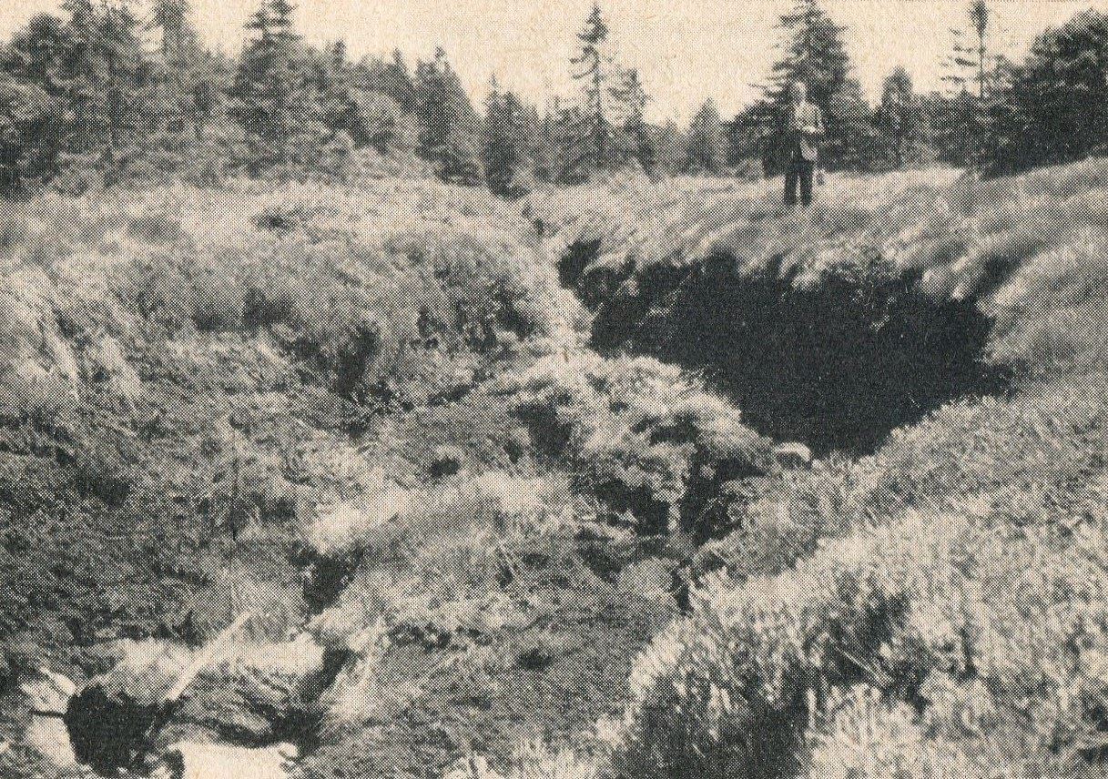 >> Selten nur dringt ein Mensch bis an diese letzten Ausläufer der Sammelanlagen vor. Sie sind nicht leicht zugänglich. Im unwegsamen, sumpfigen Urwalde voller Bracken - abgebrochenen, vom Schneedruck geknickten Fichtenstämmen - tastet man sich an einem Wasserlauf vorwärts. Bis zum Rand des Brockenfeldes oder auf dasselbe hinaus leitet der Bach den mit Gummistiefeln ausgerüsteten Wanderer. Dort im Angesicht des Brockens, das braune Moor von Sonnentaupflänzchen und Zwegbirken belebt, nagt die Abbe tiefe Furchen in die Torfdecke. Oft entstehen sie aus unterirdisch gebildeten Gerinnen,über denen die Decke einbricht.<< (Haase 1961; S. 15)
