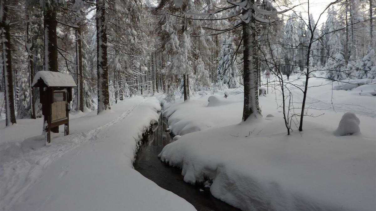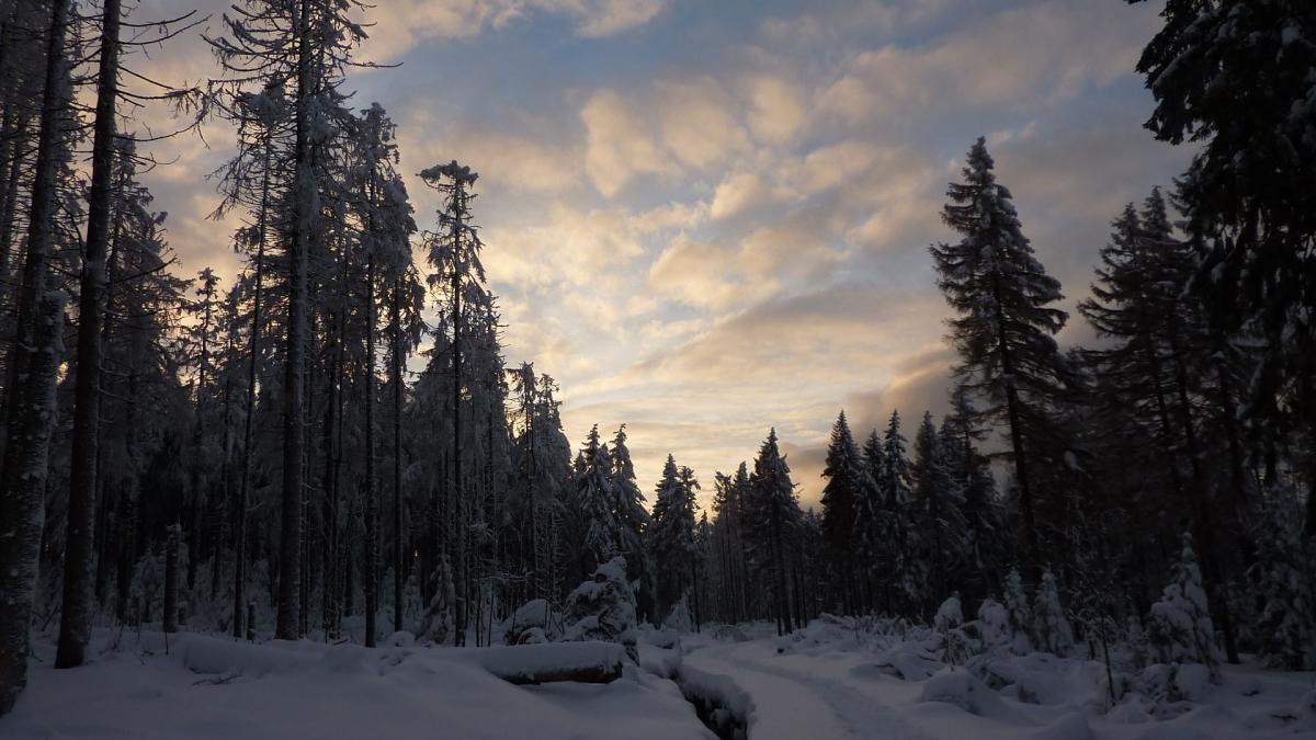 Abbegraben, Sonnenuntergang im Winter. Oberharzer Wasserwirtschaft.