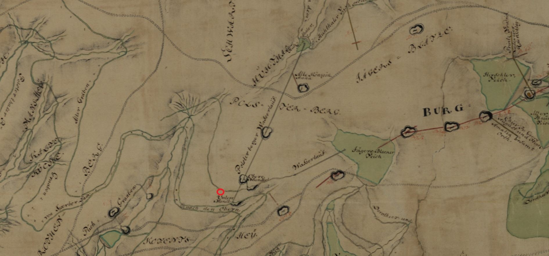 Im Hutthal ist der Untere Hutthaler Teich mit dem Mundloch des Polsterberger Wasserlaufs zu sehen. Der Obere Hutthaler Teich ist noch nicht gebaut.