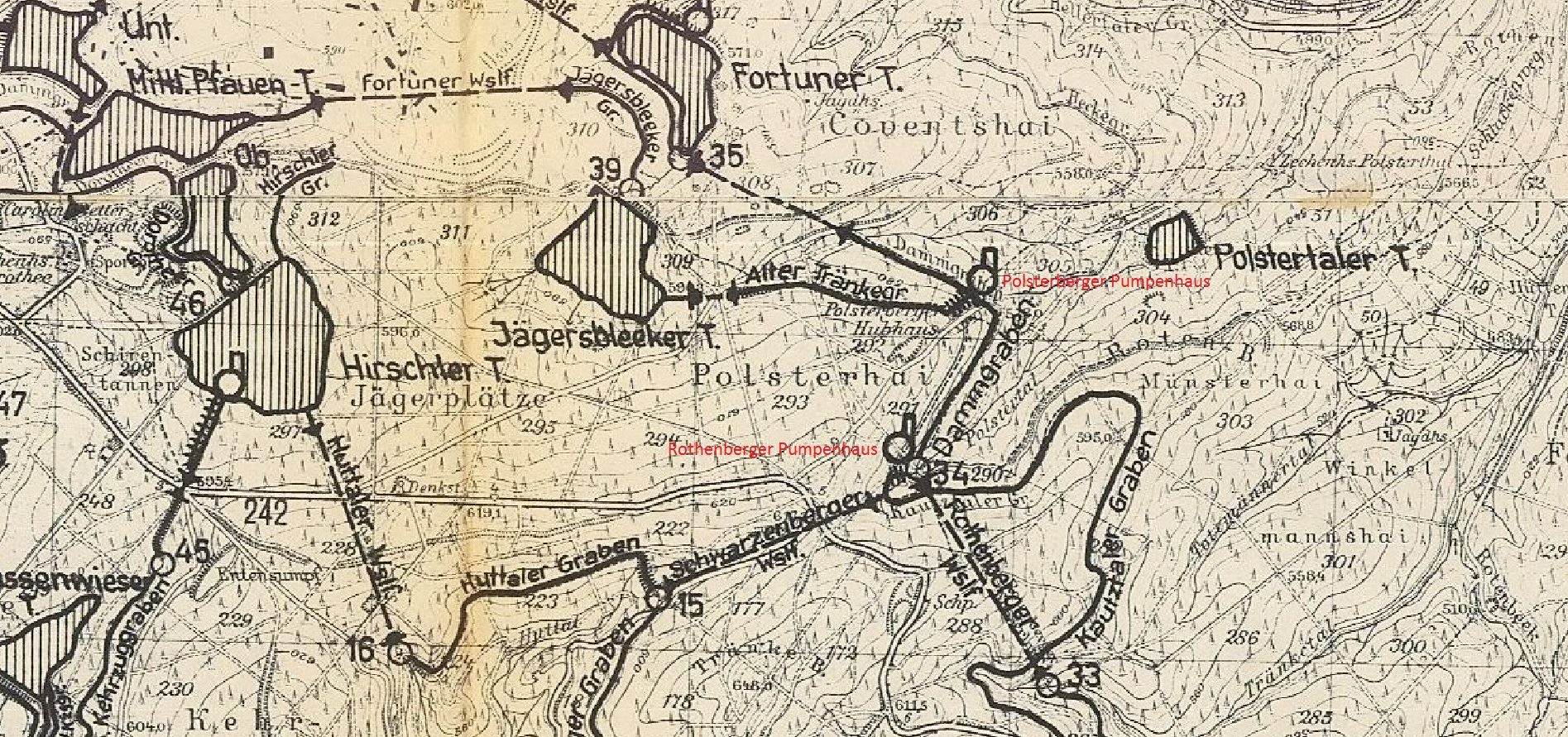 >>Hier war zu dieser Zeit Grabenwärter Kleinert mit Familie und Schwiegermutter zu Hause. Neben dem Gastwirtschaftsbetrieb war Kleinert zuständig für die umliegenden Teiche und vor allem für die beiden Pumpwerke "Rotenberg" und "Polsterberg", die Dammgrabenwasser in die beiden Tränkegräben zur Alimentierung von Hirschler Teich mit der Pfauenteichkaskade sowie dem Jägersbleeker Teich auf ein 18m über dem Dammgraben liegendes Niveau hoben. Außerdem gehörte das Pumpwerk unterhalb des Fortuner Teiches zu seinem Arbeitsrevier.<<