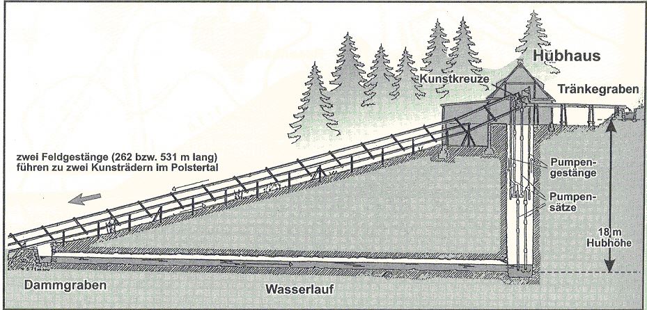 Die Kraftübertragung von den jeweiligen Kunsträdern auf die Pumpen erfolgte zunächst mit Hilfe einer Stangenkunst.