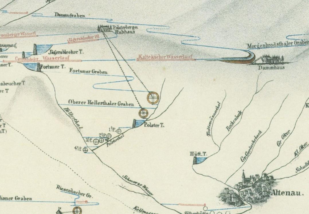 Die Karte von Sandkuhl zeigt das Geschehen 16 Jahre vor Stillegung der hölzernen Pumpen der Polsterberger Hubkunst.