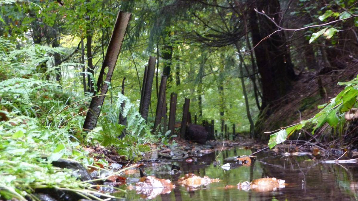 Nun entdecken wir, nach weiteren 100m, oberhalb im Wald die Reste der Sägemühle mit einem weiteren Schleiftrog.