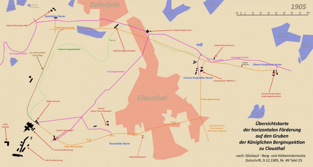 Quelle Bild: BRFBlake (2016): Übersichtskarte der horizontalen Förderung Berginspektion Clausthal 1905: URL https://de.m.wikipedia.org/wiki/Spezial:Hochgeladene_Dateien/BRFBlake Stand 12.09.2016.