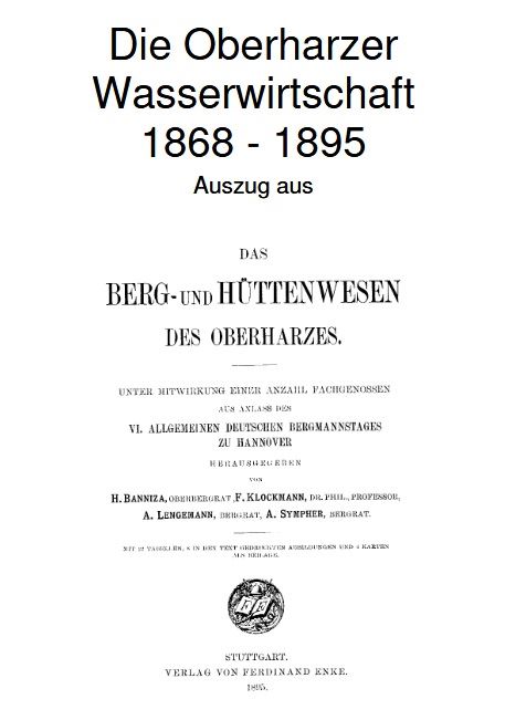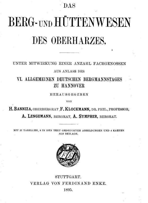Banniza, Hermann et al. (Hg.) (1895): Das Berg- und Hüttenwesen des Oberharzes : unter Mitwirkung einer Anzahl Fachgenossen aus Anlaß des VI. Allgemeinen Deutschen Bergmannstages zu Hannover / hrsg. von H. Banniza, F. Klockmann, A. Lengemann, A. Sympher. Mit 22 Tabellen, 8 in den Text gedruckten Abbildungen und 4 Karten als Beilage. Stuttgart: Enke.